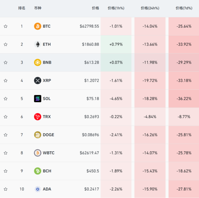 過去24小時,主流加密貨幣集體暴跌,比特幣、以太坊、狗狗幣、艾達幣等跌幅均超10%。