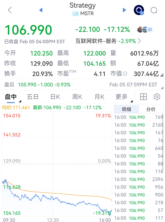 近期,Strategy Inc.發(fā)布財報,確認第四季度凈虧損124億美元,主要原因是其龐大的比特幣持倉按市值計價下跌所致。新的市場動蕩,推動比特幣價格自2023年以來首次跌破該公司持倉的累計成本價。截至2月5日收盤,Strategy當日跌幅超17%。